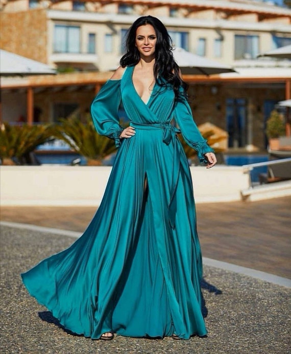Emerald Green Silk Slip Dress Emerald Silk Slit Dress Emerald Green Midi Dress Long Sleeve Emerald Green Dress Emerald Green Slip Dress Etsy